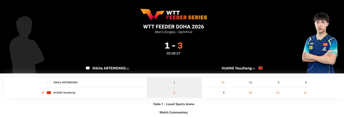 北京时间1月31日,WTT多哈支线赛男单半决赛,黄友政3-1击败尼基塔-阿尔乔缅科晋级决赛,四局比分:【6-11,12-10,11-9,11-8】。这是黄友政短短18小时连续两项进入决赛,他此前与温瑞博搭档也拿到了男双半决赛的胜利晋级决赛。