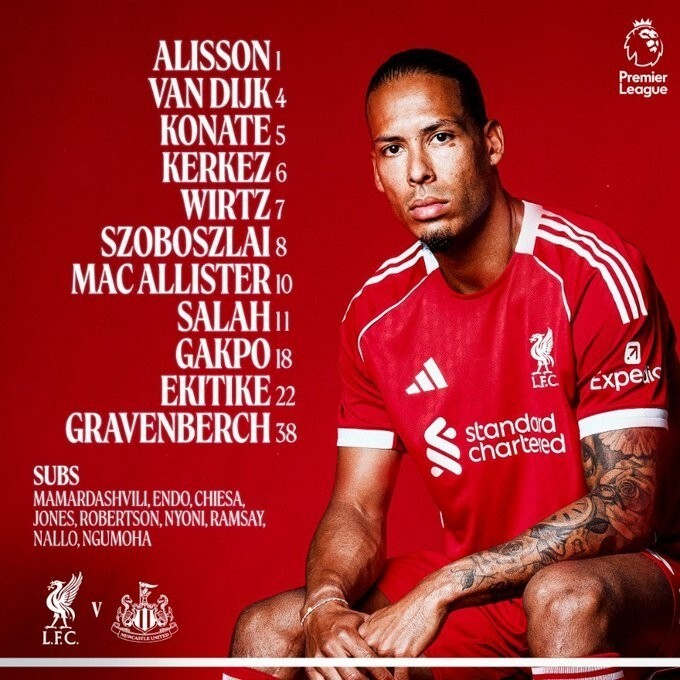 利物浦vs纽卡:萨拉赫、维尔茨、埃基蒂克首发,沃尔特马德替补