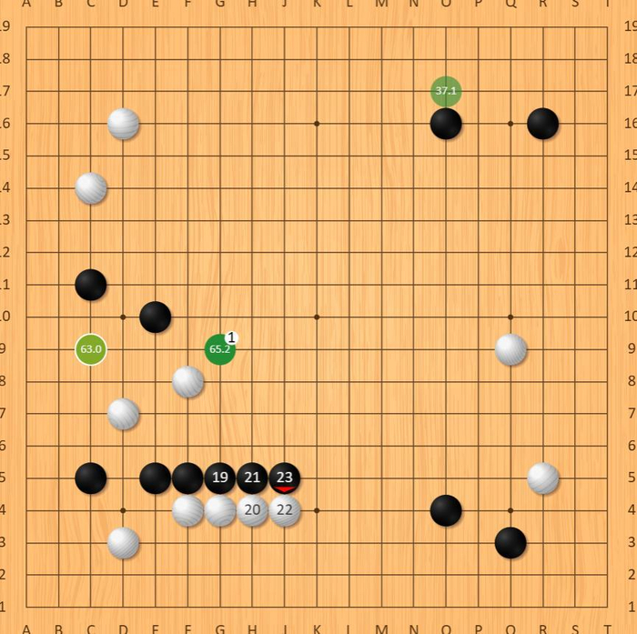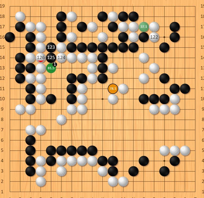 终于,随着对局的深入,两位棋手终于在中腹关乎胜负出开启了决战!右边白棋断成为了本盘对局的败笔,黑棋随即在中腹相连之后奠定了局面胜势!