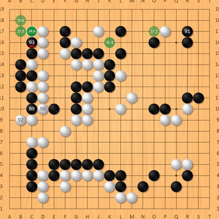 实战中,党毅飞执黑。序盘布局中,黑棋以实地为主,快速抢占左上、右上和右下的角落实地,当然中腹也持续进军,压制白棋的势力!(1.17完)