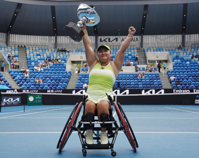 而在轮椅网球女单决赛中,中国球员李晓辉以2-0战胜荷兰人德格鲁特,夺得冠军。前一日,李晓辉还搭档王紫莹获得了女双冠军,这样一来,李晓辉就成为了本届澳网的轮椅网球“双冠女王”,恭喜她!