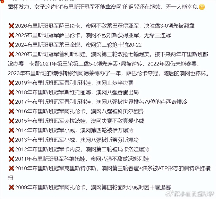 有博主认为这是来自布里斯班冠军的诅咒,自2009年布里斯班冠军无法拿到澳网冠军的诅咒就一直延续,目前已经延续了整整17年之久。(2025布里斯班冠军萨巴伦卡,澳网决赛不敌凯斯获得亚军,2026萨巴伦卡又是布里斯班冠军,澳网决赛又不敌莱巴金娜)