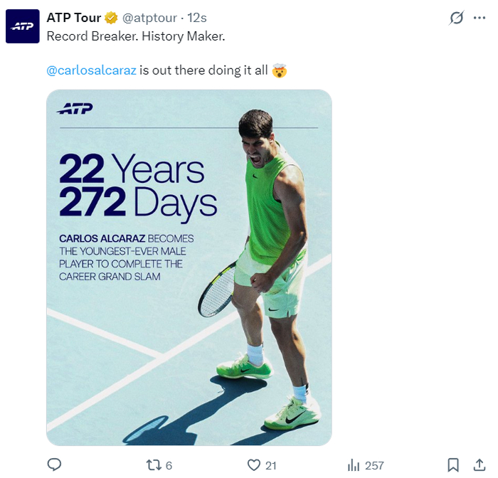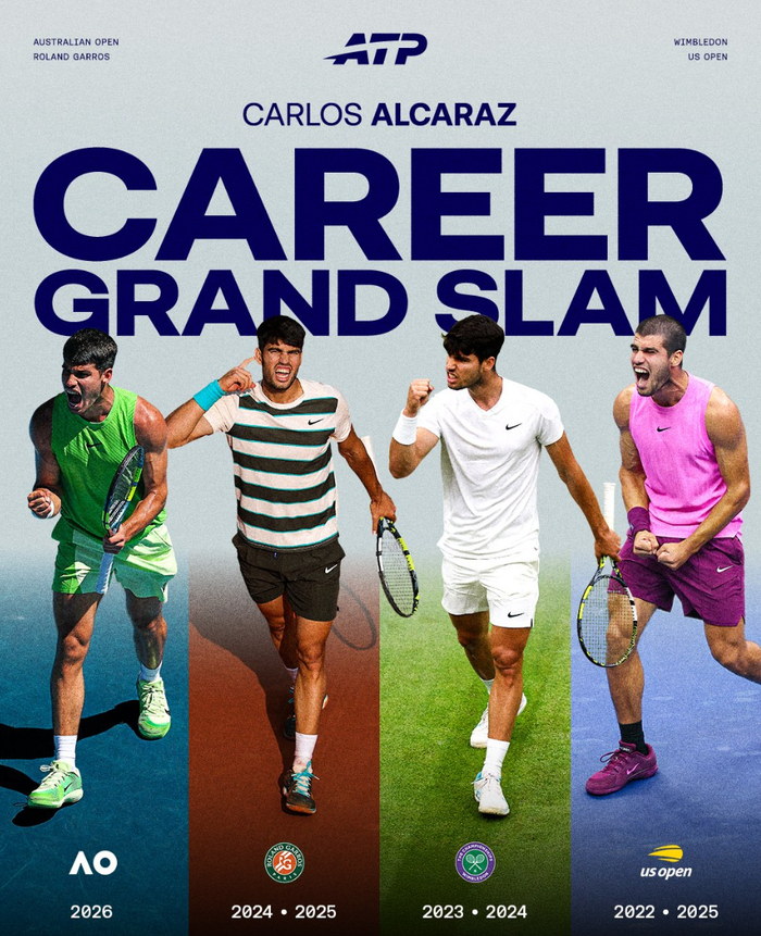 2026澳网是阿卡丰收的大赛,他生涯首次闯入澳网4强就拿到了冠军,他超越24岁的纳达尔成为公开赛年代最年轻的男子‘全满贯’选手,目前阿尔卡拉斯只有22岁272天,ATP官方写道:纪录的创造者、历史的缔造者。