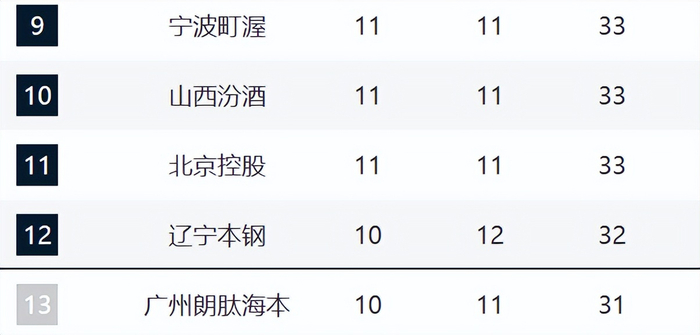 9-13分别是宁波、山西、北控、辽宁和广州。宁波现在获得两连胜,他们再度回暖。山西这轮击败吉林,也算是止住颓势了,没了张宁对他们的影响非常大,不过盖伊好像可以弥补一号位的劣势。北控最近已经四连胜了,攻守都在回暖,他们完成了崛起。辽宁大胜天津,又回到了前12的位置。广州已经三连败了,他们还是欠缺控卫。