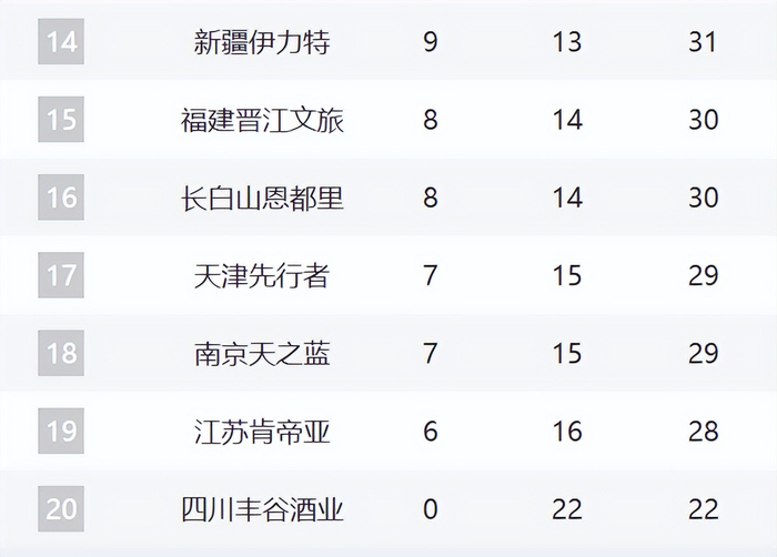 14-20分别是新疆、福建、吉林、天津、同曦、江苏和四川。新疆这轮击败四川,不过窗口期对他们非常重要,看看格兰能不能建立好的攻守体系。福建、吉林、天津、同曦、江苏这轮全部都输球了,特别是吉林已经三连败,估计福建和吉林的战绩会持续下跌。至于同曦,这轮郭昊文没有打,导致他们溃败上海。天津和江苏最近的趋势不错,但分别输给了辽宁和深圳,但后续依然有希望成为搅局者。四川22连败,气势越来越低了。