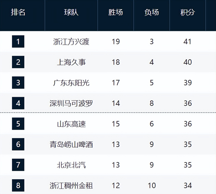 深圳和山东排在第四与第五。目前山东是少打一场比赛,但胜场比深圳多,理论上他们就是第四的排名了。当然最近这两支球队的战绩都非常好,10场全部赢了8场。