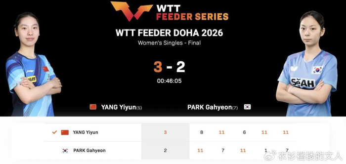比赛一上来,双方都使出了浑身解数,都不再保留,比分也是交替增加。一番激战后杨屹韵有点松懈,被对手拿下首局的局分。第二局,杨屹韵展开了绝地反击,很快便扳回一城。遗憾的是,第三局她又失利了。这一局,杨屹韵打得比较凌乱,有点泄气了。之后,杨屹韵做出了及时调整,并且改变了打法。结果,她就像换了一个人,打得非常凶猛。最后,杨屹韵以3-2的比分逆转对手,成功拿下自己在2026年的首个WTT赛事冠军。