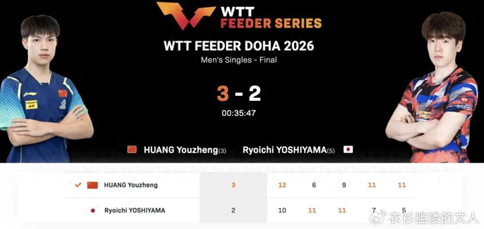 随着男单决赛的结束,2026年WTT支线赛多哈站落下帷幕。在男单决赛上,交手的双方是国乒小将黄友政和日本球员吉山僚一。比赛一开始,双方就展开了激烈的争夺。在以12-10艰难拿下第一局后,黄友政有点急躁,在比赛中屡次失误,吉山僚一趁机连下两城。在大比分1-2落后的情况下,黄友政终于迎来了大爆发,他接连强势夺分。最后,黄友政以3-2的比分逆转击败吉山僚一,夺得男单冠军。