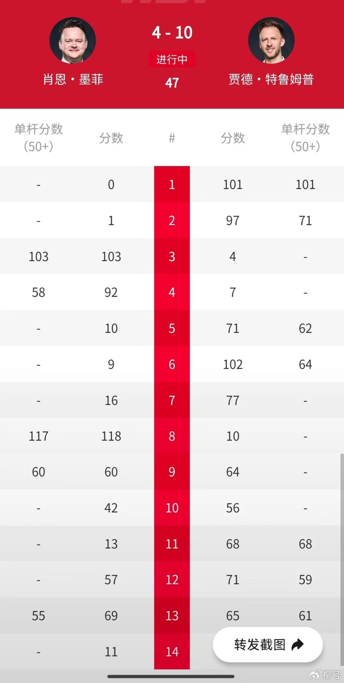 来到决赛第一阶段,两位球员眼看打得非常激烈,特鲁姆普轰出一杆破百(101分)和三杆50+(71分、62分、64分),墨菲则轰出两杆破百(103分、117分)和一杆50+(58分)。第一阶段结束后,世界第一特鲁姆普以5-3的比分暂时领先墨菲,赢得冠军战的先机,但优势并不大。如果在第二阶段有出色发挥,逆转夺冠的希望还是非常大。不过,来到第二阶段,墨菲突然哑火,特鲁姆普轰出一波5-1的攻势,总比分10-4横扫夺得冠军,同时终结14个月的冠军荒,祝贺特鲁姆普!