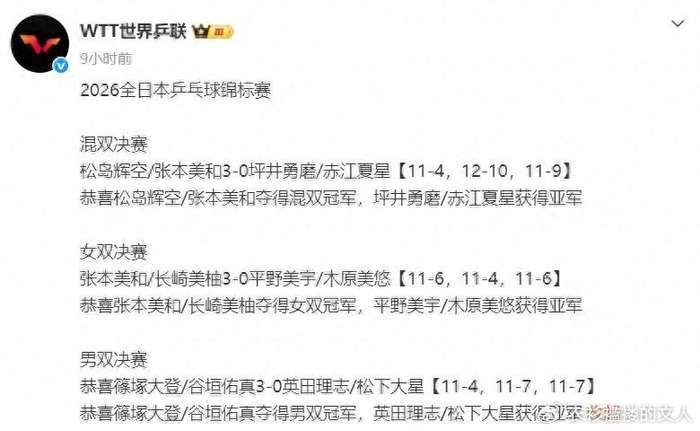 随着双打决赛的接连结束,2026全日本乒乓球锦标赛正式落下帷幕。三场双打决赛的赛况是这样的:混双决赛,松岛辉空和张本美和3-0横扫坪井勇磨和赤江夏星,夺得冠军,具体比分是11-4、12-10、11-9;男双决赛,篠塚大登和谷垣佑真3-0横扫英田理志和松下大星,夺得冠军,具体比分是11-4、11-7、11-7;女双决赛,张本美和和长崎美柚3-0横扫平野美宇和木原美悠,夺得冠军,具体比分是11-6、11-4、11-6。