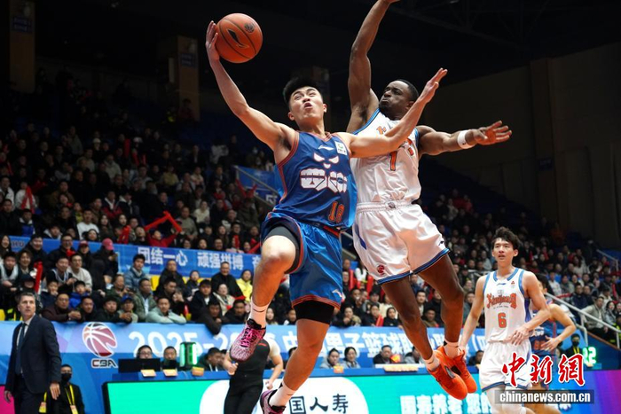 2月1日,在四川省成都市温江区体育馆举行的2025-2026中国男子篮球职业联赛(CBA)常规赛比赛中,四川丰谷酒业队主场以47:105负于新疆伊力特队。图为四川丰谷酒业队员于枭永(蓝衣)上篮遭到对手追身防守。中新社记者 吕杨 摄