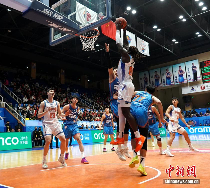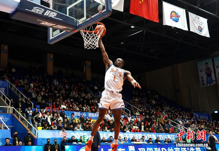 2月1日,在四川省成都市温江区体育馆举行的2025-2026中国男子篮球职业联赛(CBA)常规赛比赛中,四川丰谷酒业队主场以47:105负于新疆伊力特队。图为新疆伊力特队外援(白衣)飞身扣篮。中新社记者 吕杨 摄