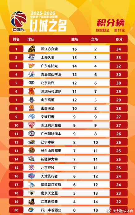 积分榜第13名则是吉林队,他们的战绩则是7胜11负,下一轮比赛,一旦吉林队赢球的话,他们便有望超越辽宁队,杀回积分榜前12名。而第14名则是新疆队,他们的战绩也是7胜11负。第15名则是北控队。第16名则是天津队,第17名则是福建队,他们的战绩都是6胜12负。第18名则是同曦队。排在第19名则是江苏队,战绩为4胜14负。而排名积分榜垫底的是四川队,他们已经遭遇18连败。
