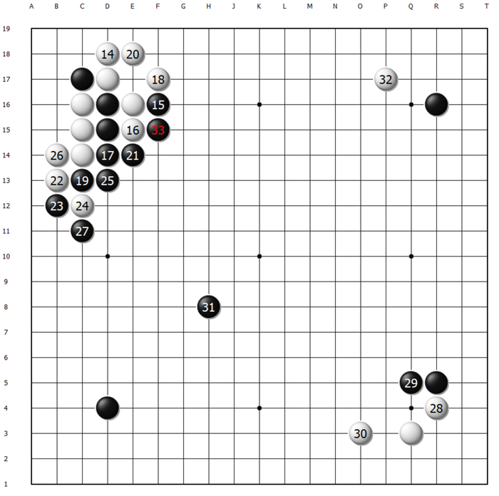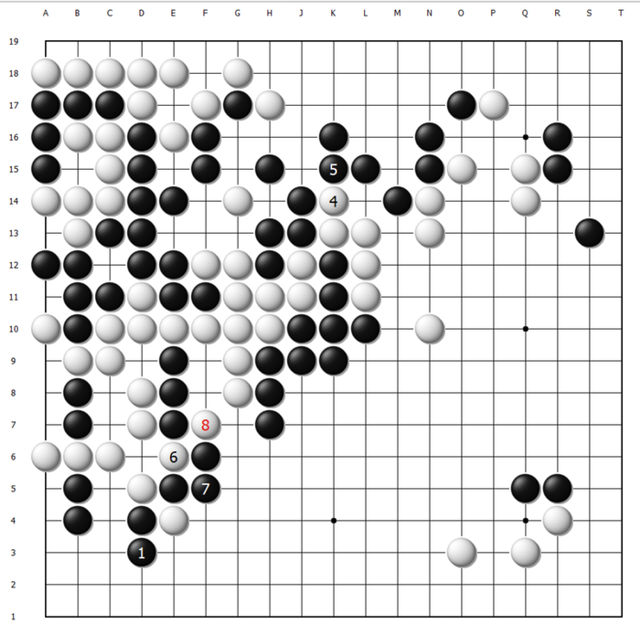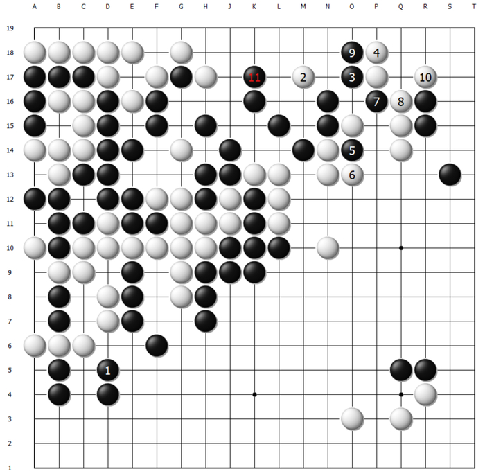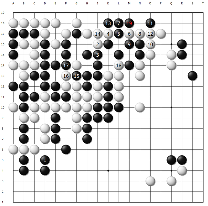 实战申旻埈成功封锁白棋,并借助左上角定式的后续手段,将A12的一路立变为先手,白棋大龙已岌岌可危。