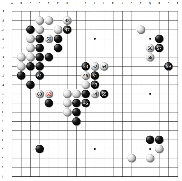 白62爬回,在整条大龙安危未定之时,这样笨重的爬回并非好棋。此时白棋选择靠、飞、跳或点等轻灵手法,都更易于构筑眼形。
