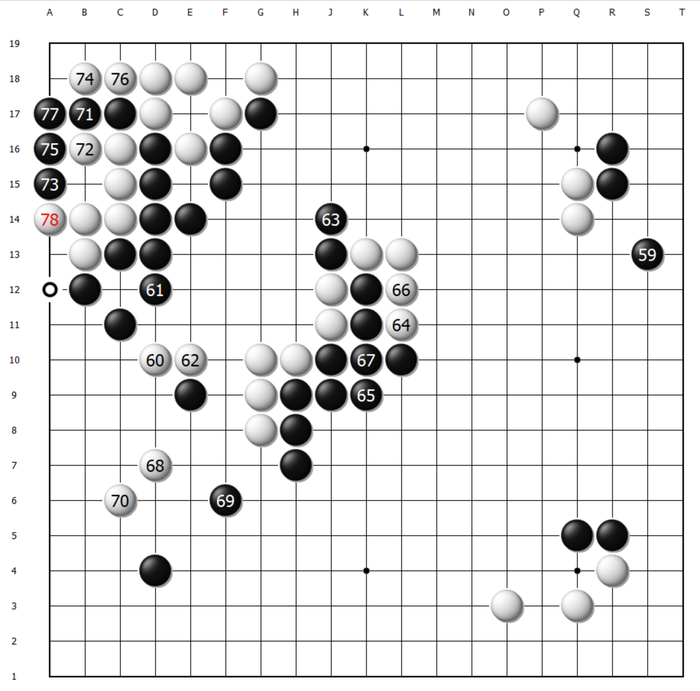 实战申旻埈或许觉得中央的定型较难把握,于是选择跟随白棋步调行事,计划着见招拆招。白60直接点在D10位,这已是朴珉奎本局第三次利用C12一子的引征作用。申旻埈此次干净地提掉,不留隐患。