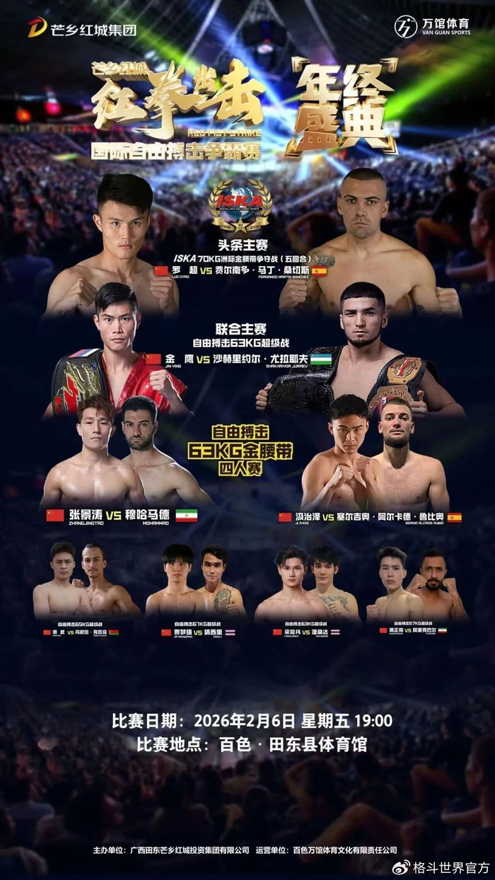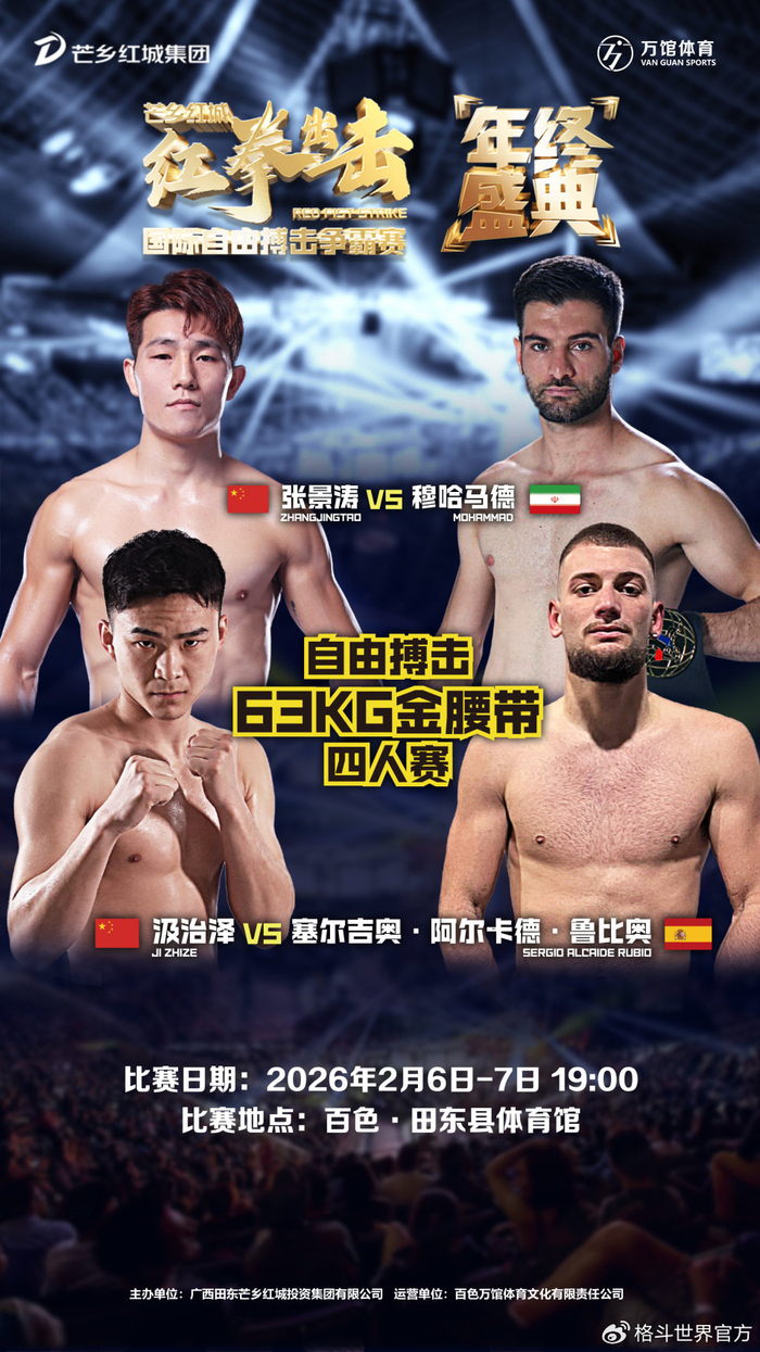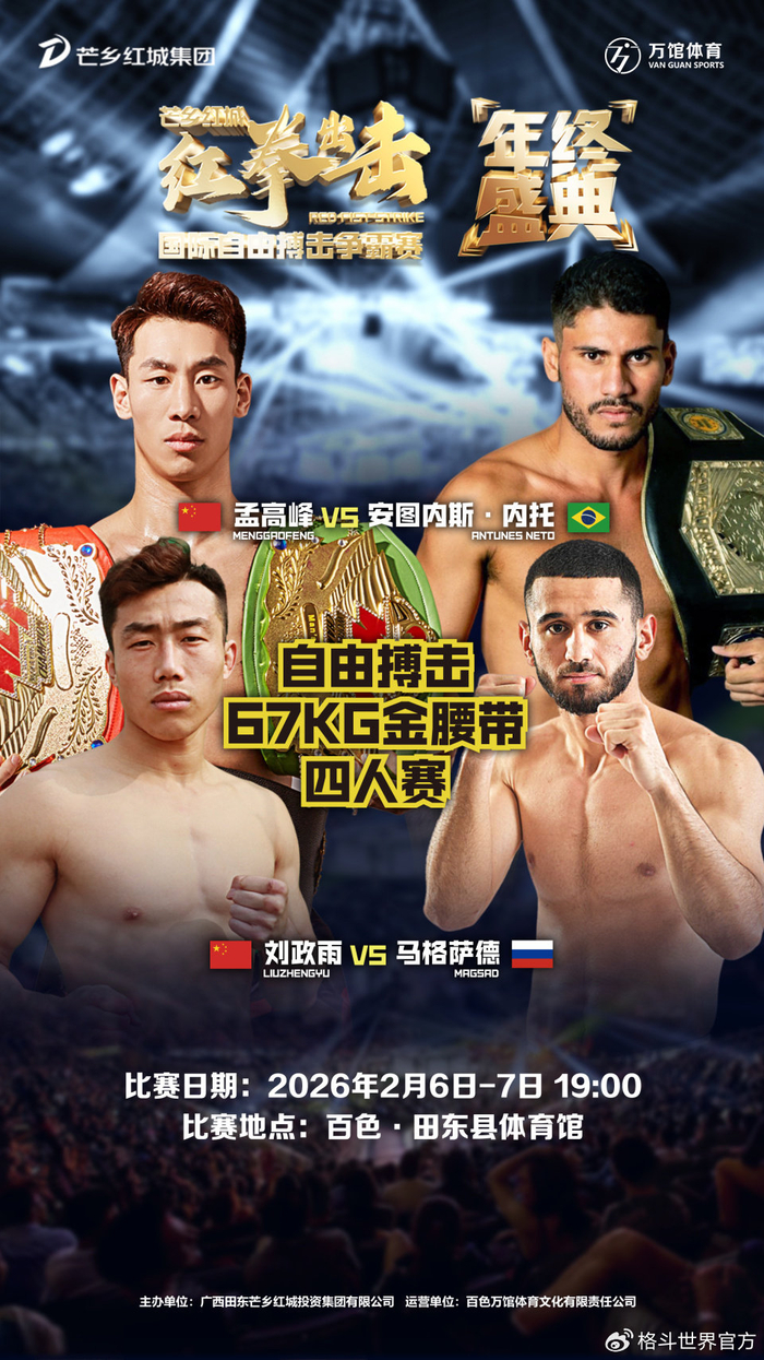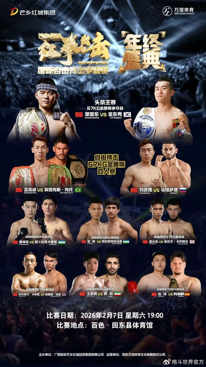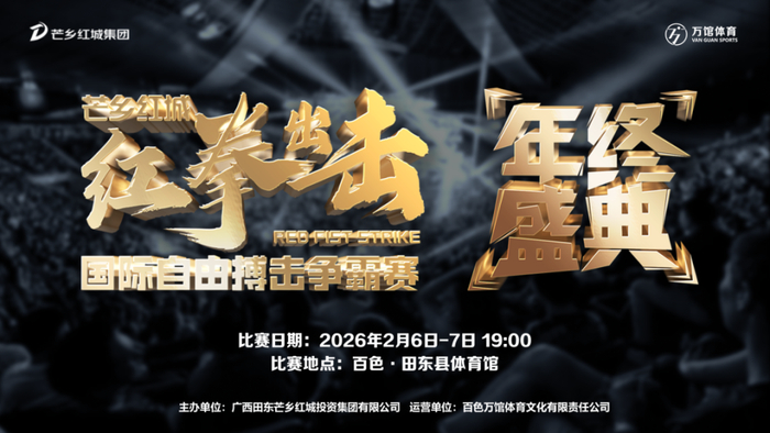 为持续提升广西田东县“红色热土、古壮拳非遗、芒果之乡”城市形象,弘扬中华体育精神与传统武术文化,探索“体育+文旅”融合发展新路径,推动区域文化产业升级与经济高质量发展,兹定于2026年2月6日至7日,在田东县体育馆举办“芒乡红城‘红拳出击’国际自由搏击争霸赛年终盛典”。