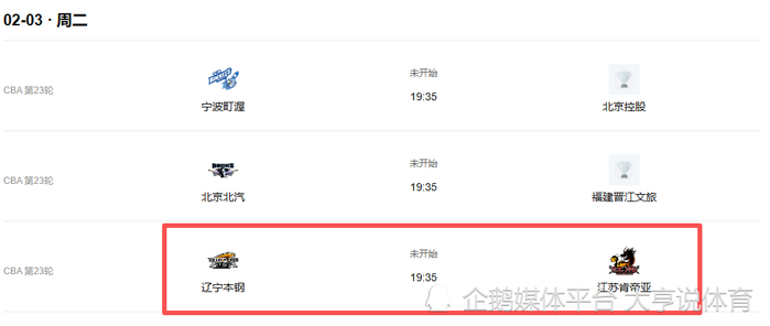 今日赛事:2月3日晚19点30,CBA焦点战辽篮对战江苏央视不直播