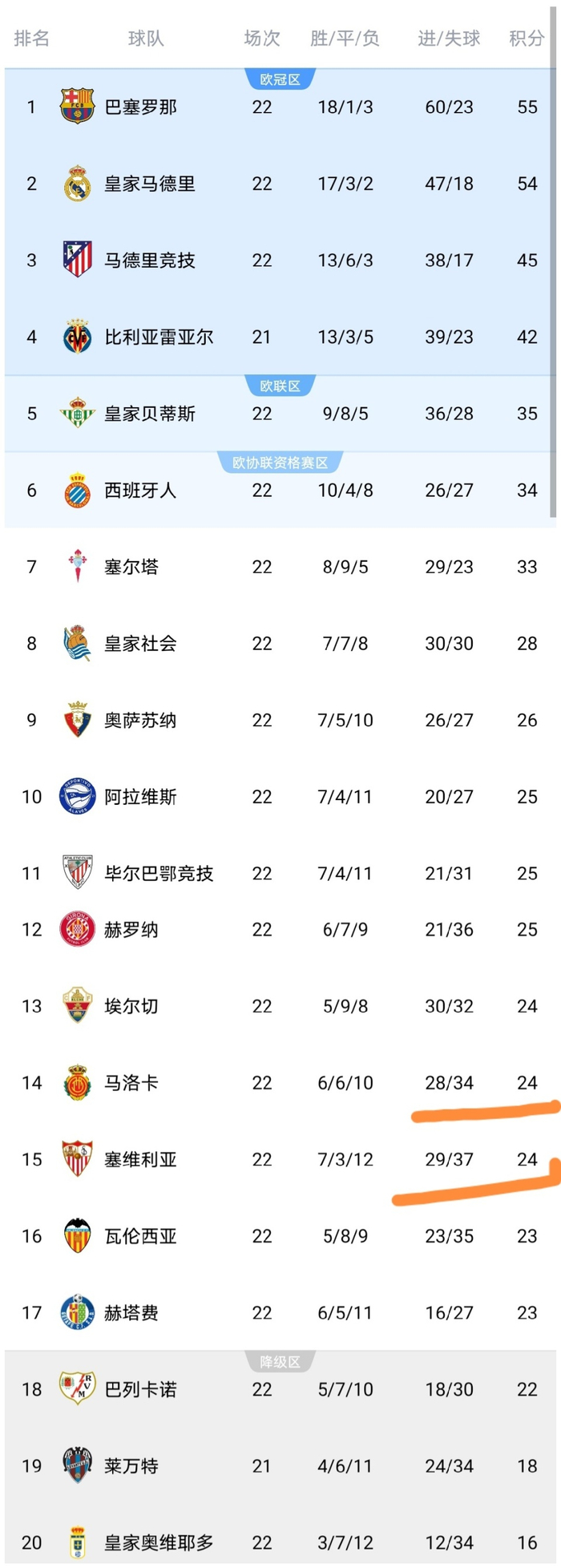 今天凌晨,西甲第22轮结束了最后一场的较量,马略卡、塞维利亚队出战,这场较量之后,西甲所有球队都已经踢完了第22轮的比赛,西甲积分榜发生变化,我们来看看。