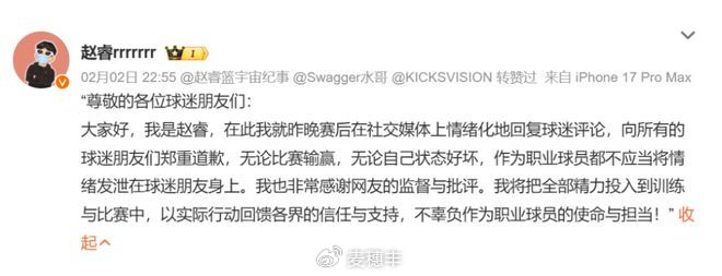 如此一来,赵睿终于又惹祸了,昨天一整天之内都有很多人去找他,跟他强调这个问题的严重性。终于在昨天傍晚,赵睿公开道歉,但还是被质疑不够诚恳,并没有专门向新疆球迷道歉。