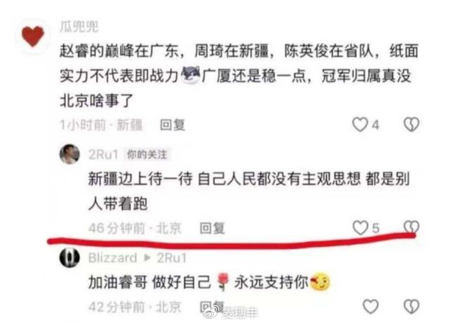 结果在赛后,气急败坏的赵睿打开了个人社媒账号,开始跟球迷对线,其中就瞄准了IP在新疆的球迷,开始胡乱说话,一下子引起了新疆球迷的愤怒。更为关键的是,赵睿的措辞出现了很严重的错误,他针对的不仅仅是球迷,而是更广大的群体。