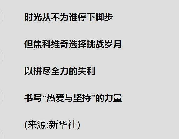 文章中对38岁零9个月的德约科维奇在赛场上展现出的坚韧与拼搏精神给予高度肯定和赞扬,并在文章末尾写道,“时光从不为谁停下脚步,但焦科维奇选择挑战岁月,以拼尽全力的失利书写热爱与坚持的力量!”