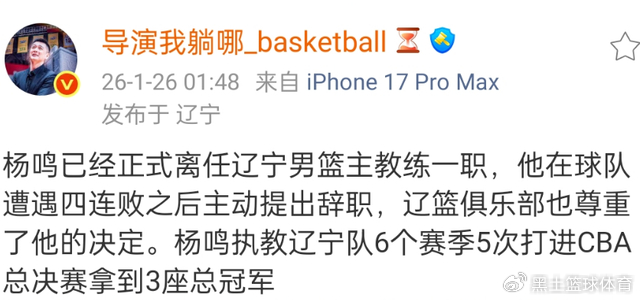 赛季第二个四连败,20年来球队最低得分,单节只得到了4分,辽宁男篮在输给新疆男篮之后,媒体曝出了杨鸣主动提出了辞职,通过多次沟通后,辽宁男篮同时了杨鸣的请辞,选择了换帅,后面的比赛将会有乌戈来带队。