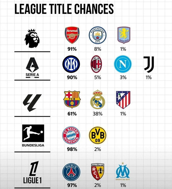 五大联赛夺冠概率出炉:英超德甲意甲法甲领头羊均超9成胜算 巴萨皇马64开成唯一悬念