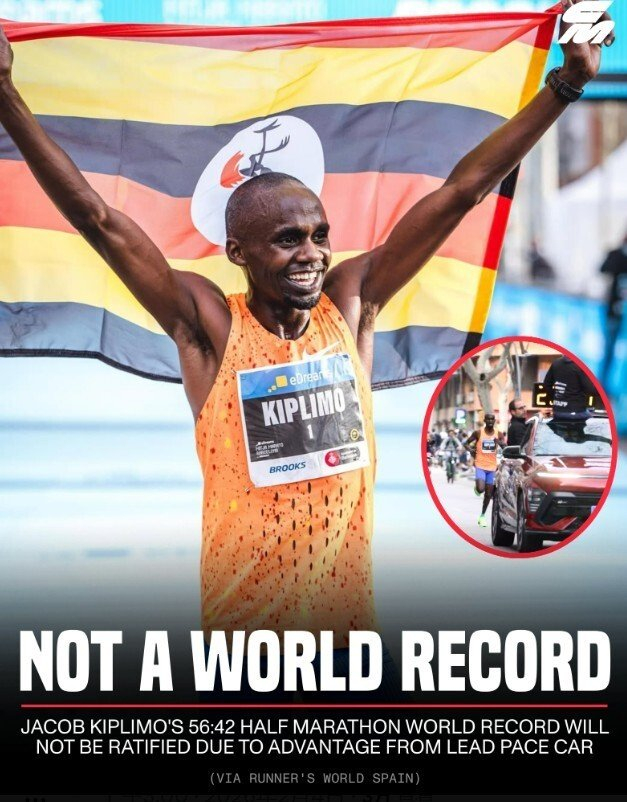 世界纪录认证委员会认为,基普利莫在去年巴塞罗那半马惊为天人的56分42秒(比原纪录提升48秒),是使用了违规辅助手段下完成的,最主要的是他距离领跑车的距离太近,利用了汽车尾流来减少空气阻力。