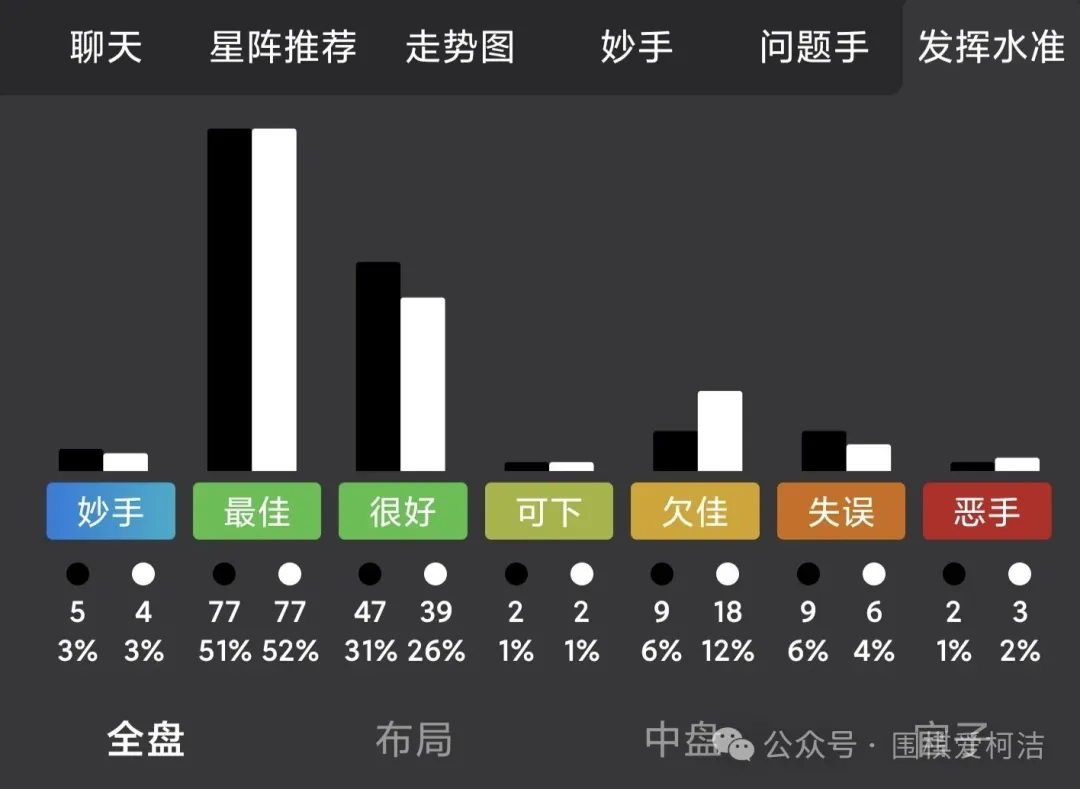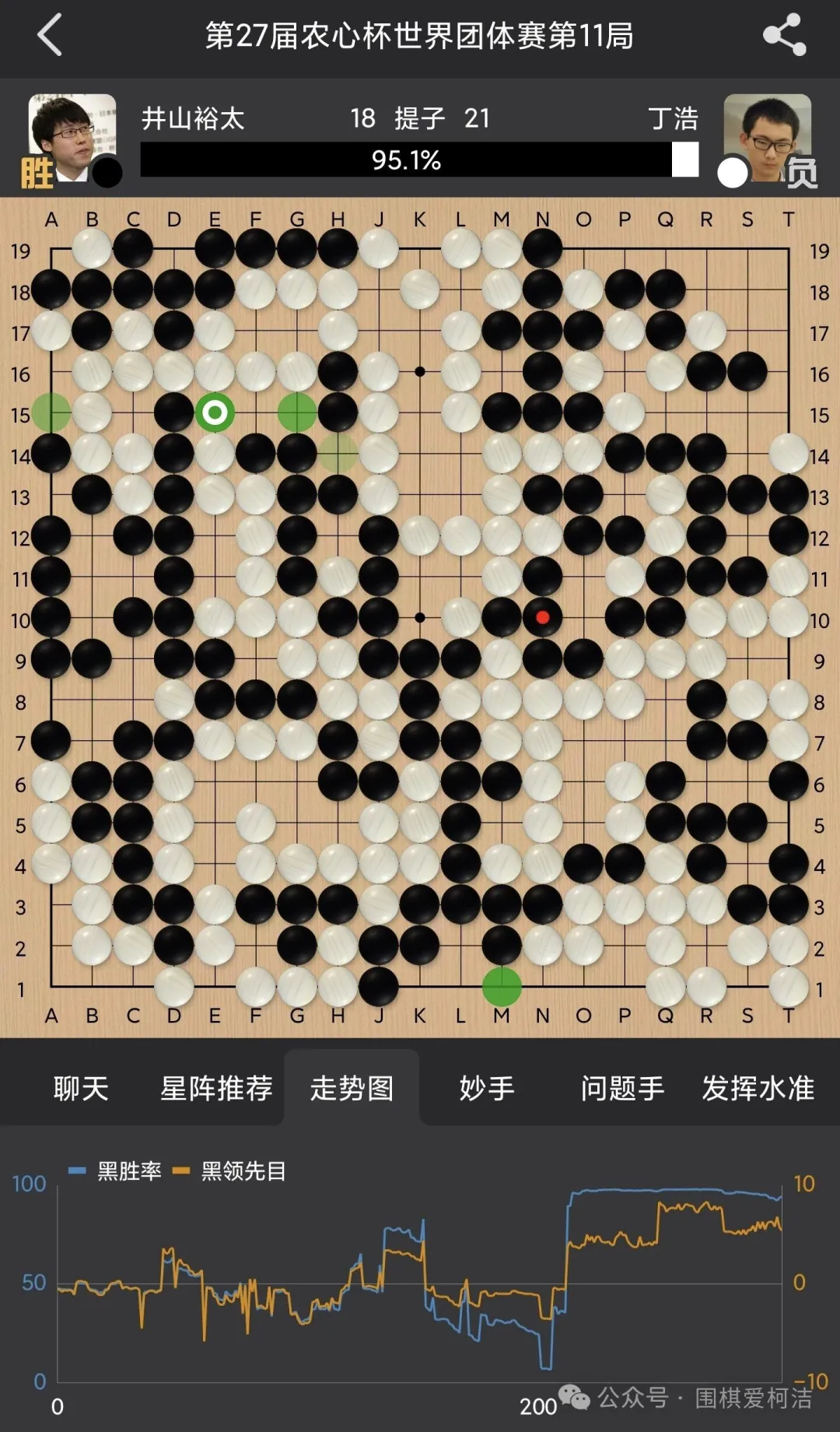 一度局面优势尽显,不过右上的劫争中,丁浩判断更为精准,一步步逆转了对局。可惜在收官中,丁浩一着不慎,右上数子惨被包围后遗憾战败!