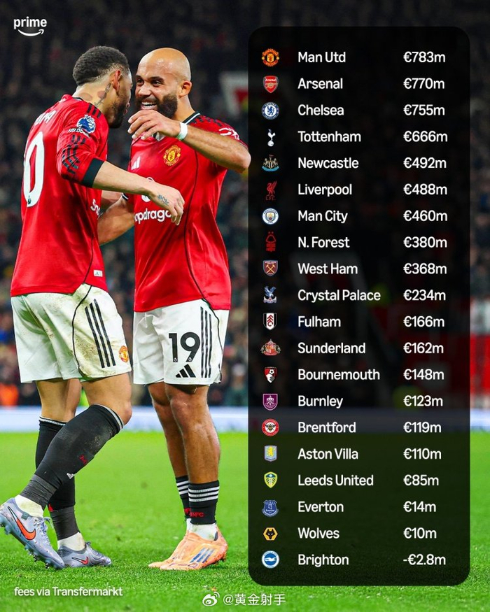 英超5年净支出榜曼联7.83亿居首,布莱顿唯一盈利