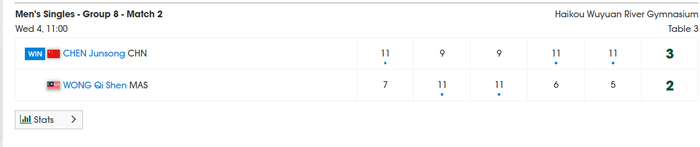 国乒小将陈俊菘也拿下了首胜,他在2026赛季已经连续打了三站(多哈球星挑战赛、马斯喀特常规挑战赛、多哈支线赛),他这场面对马来西亚黄祺燊打得并不轻松,最终陈俊菘是3-2拒绝逆转,五局比分:11-7、9-11、9-11、11-6、11-5。