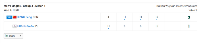 向鹏是中国男篮的主力之一,他的首秀也还算不错,面对张佑安他只用了四局就拿下胜利,四局比分:4-11、11-5、11-5、12-10,在大比分0-1落后的情况下连赢三局。