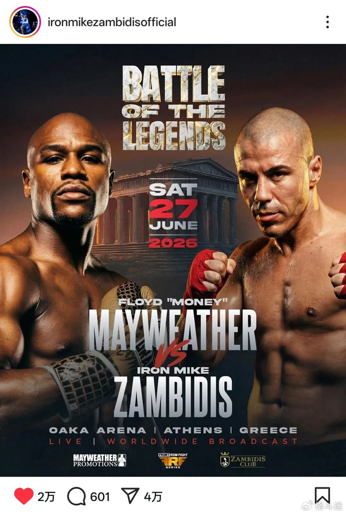 当梅威瑟的不败传奇遇上“铁拳迈克”迈克·赞比迪斯的希腊铁拳,一场属于拳击与踢拳领域的跨界对决,即将在2026年6月27日的雅典上演。