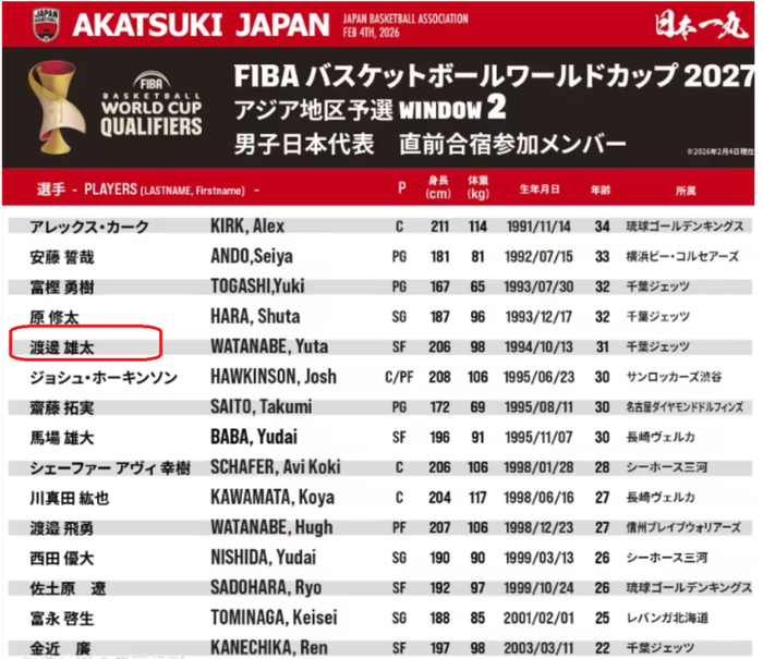 2027年男篮世界杯,第二阶段的比赛,将会在2月26日开打,中国男篮将会客场PK日本队。为了准备这场比赛,日本队在今天,也是正式公布了15人集训大名单,从这份大名单来看,有两名归化球员霍金森、阿莱克斯-柯克入选,渡边雄太也是名列其中!