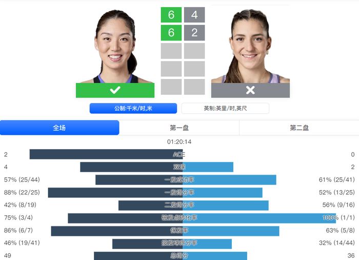 全场数据统计,王欣瑜轰出2个ACE球,也有4个双误,另外一发成功率57比61%,一发得分率88%比52%,二发得分率42%比56%,破发点转化率75%比100%,保发率86%比63%,接发球得分率46%比32%,总得分49比36。