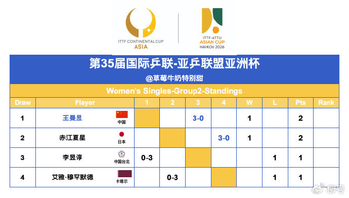 其中,世界第二王曼昱是赛事女单卫冕冠军,本次比赛,她被分在第二组,同组还有赤江夏星、李昱谆、艾雅-穆罕默德。小组循环赛第一轮,王曼昱的对手是中国台北的李昱谆,这场比赛,王曼昱的发挥极其出色,她在比赛中轰出11-2,最终以3-0取得开门红。