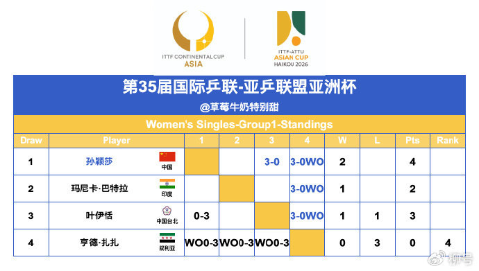 再次出战亚洲杯,孙颖莎的目标无疑是再次冲冠。不过,刚刚伤愈复出能否恢复到最佳状态还很难说。本次比赛,孙颖莎被分在第一组,她在小组循环赛第一轮的对手是叶伊恬,结果以3-0完胜。