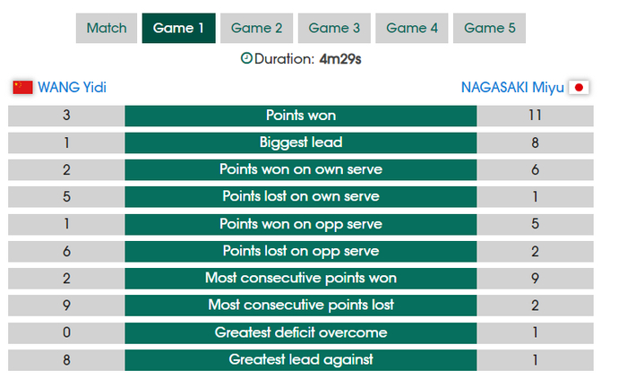 第一局开场王艺迪就被长崎美柚给打崩了,短短4分29秒就结束了第一局,这一局王艺迪只拿到3分,各种的低级失误令人无奈。