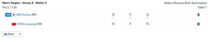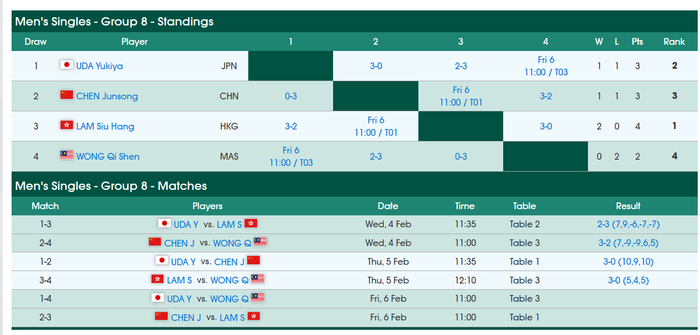 这场比赛后在G8组的林兆恒(2胜0负),一场3-2,一场3-0小组第一;宇田幸矢(1胜1负),一场3-0,一场2-3他暂列小组第二;陈俊菘(1胜1负),一场3-2、一场0-3排小组第三。