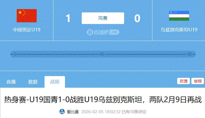 北京时间2月5日晚上,也就是今天,中国男足U19跟乌兹别克斯坦U19进行一场封闭的热身赛,最终中国队1-0小胜对手,双方还有一场热身赛,将在2月9日进行。