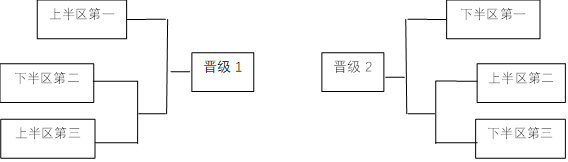 (1)赛会制,组内6支球队分为上、下两个半区(组序1、3、5号位为上半区、组序2、4、6号位为下半区),每个半区内的3支球队先进行单循环比赛。根据单循环比赛排名再进行两轮交叉赛。