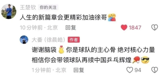 王楚钦第一时间留言道:“人生新篇章会更精彩,加油徐哥!”徐晨皓回复:“谢谢脑袋,你是球队的主心骨,绝对核心力量,相信你会带领球队再续中国乒乓辉煌。”