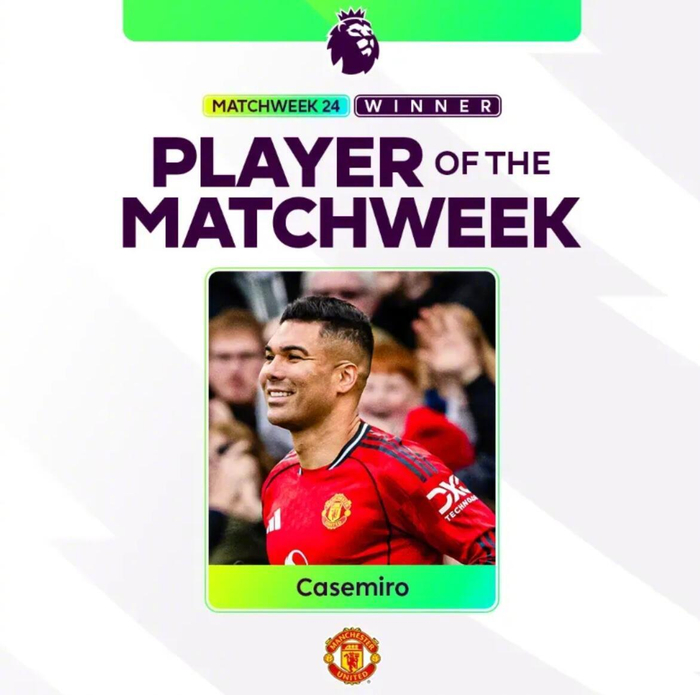 英超官方公布第24轮周最佳球员,曼联中场卡塞米罗凭借对阵富勒姆的传射建功当选。至此,英超第21至24轮周最佳已全部被曼联球员包揽。