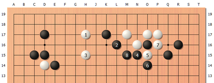 田中康湧说他在意参考图里白1的打入。对此,黑2向反方向的小尖是好手,即使白3逃出,接下来黑4以下的封锁也很顺,走到黑8时,反倒可能让白1和白3两子成了包袱。