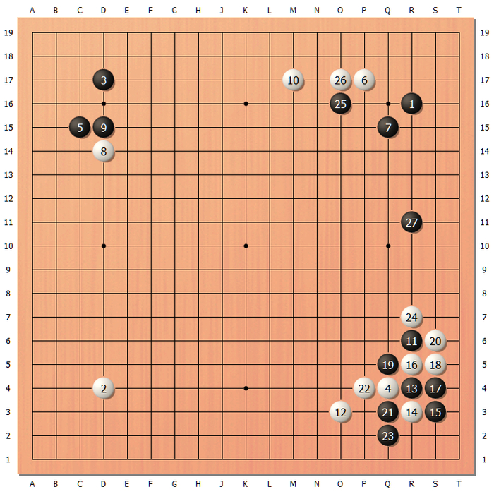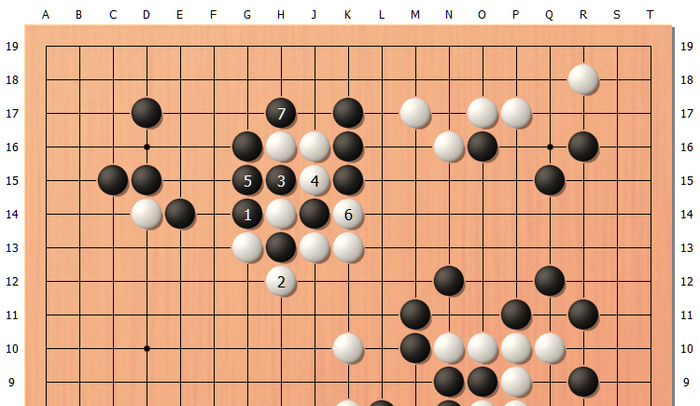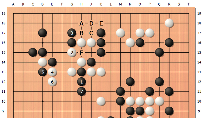 因此另一种思路是参考图的黑1,又是AI喜欢的碰。如果白棋以白2和白4最强应对,黑5起到黑17左右会发展为一场攻防,这样看来黑棋也能一战。顺带一提,白2改走白6位,黑2位后形状并不好,显得局促。