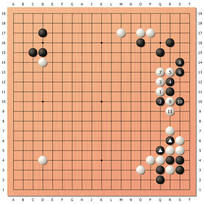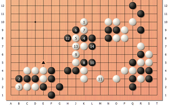 参考图中的白1碰。到处随手就碰的手法可说是AI的专利,但其后白3到5的构想很难想到,目的在于白9的断。如此一来,黑△自然会变弱,白棋成功掌握战斗主导权。
