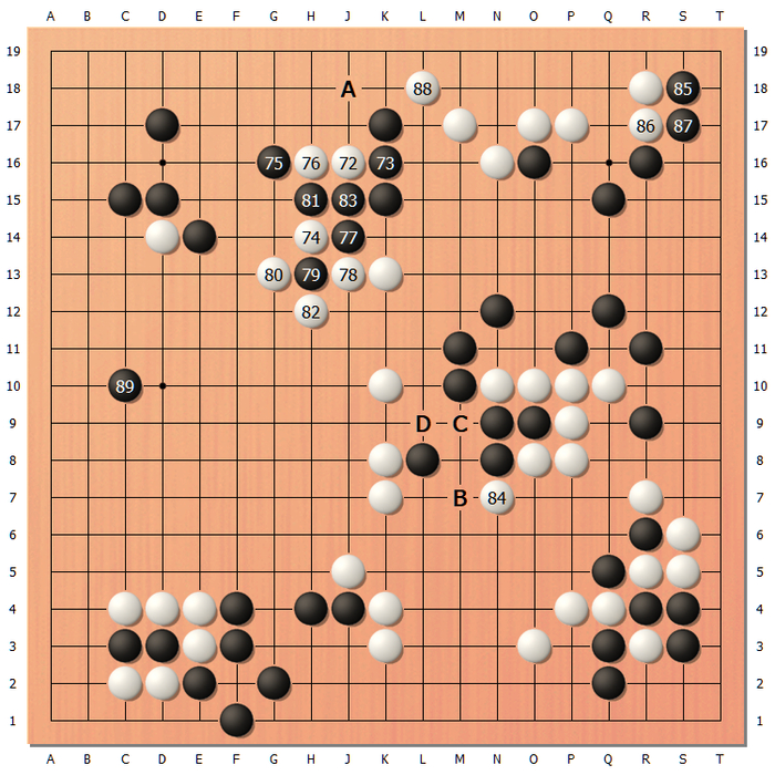 然而佐田笃史却以白64开始温柔地把黑棋放走。他想带到白68,瞄着左上角;更重要的是,他贯彻“不急于胜负、直到终盘都保持稳定心态”的方针。