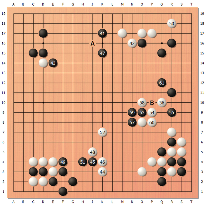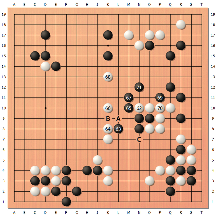 从黑53开始,围绕白棋模样的攻防持续。黑55原本应走B,但白56是好手,黑棋没有对策,只得以黑55调整节奏,把主动权交给对方。佐田笃史虽有些措手不及,但对白56以下仍是稳稳应对。