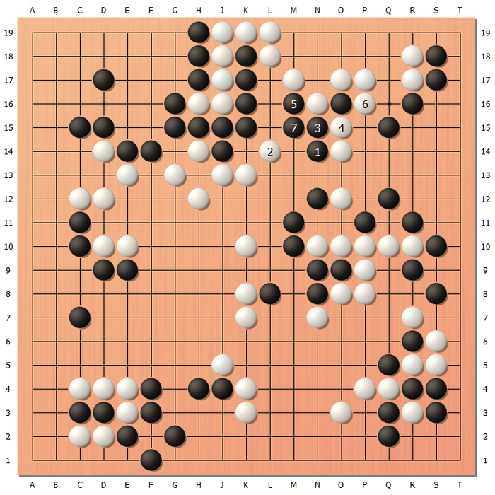 而AI还给出灵活的下法,黑79时参考图的黑1,是巧妙的反断,很有趣。若进展到黑7便可无伤大雅,因此白2更想从白3位去拼,但如果白2长出去的话,就能看出与前一个参考图大有不相同。于是白78应当走A位才是正确。